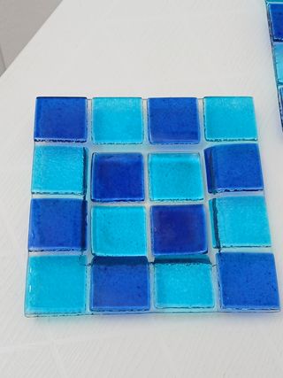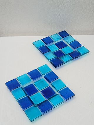 Elegante posacenere realizzato con tessere di vetro colorate. - Design a scacchiera con tessere blu e turchesi. - Materiale in vetro. - Pezzi unici fatti a mano.