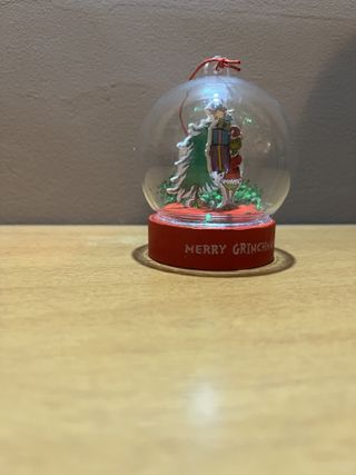 Deliziosa sfera di Natale a tema Grinch, perfetta per aggiungere un tocco festivo. - Design con Grinch, albero e regali. - Base rossa con scritta Merry Grinchmas. In plastica no vetro.