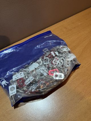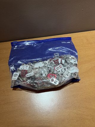 Busta piena di linguette di lattine, pronte per essere riutilizzate o collezionate. - Materiale: alluminio - Colore: misto (argento, rosso)