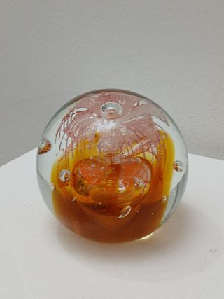 Bellissimo fermacarte in vetro artistico di Murano. Un pezzo unico che aggiunge un tocco di eleganza. - Realizzato in vetro soffiato. - Inserimenti di colore arancione e rosso. - Bollicine d'aria intrappolate nel vetro.