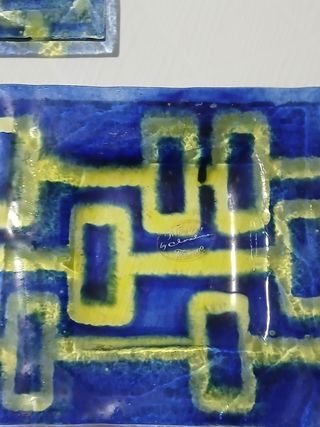 Coppia di posacenere vintage in vetro di Murano. - Design moderno con motivi geometrici. - Colori blu e giallo. - Pezzi unici da collezione.