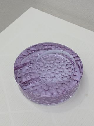 Elegante posacenere vintage in vetro di Murano, con una bellissima sfumatura viola. - Design rotondo. - Superficie interna lavorata. - Bordo liscio e trasparente.