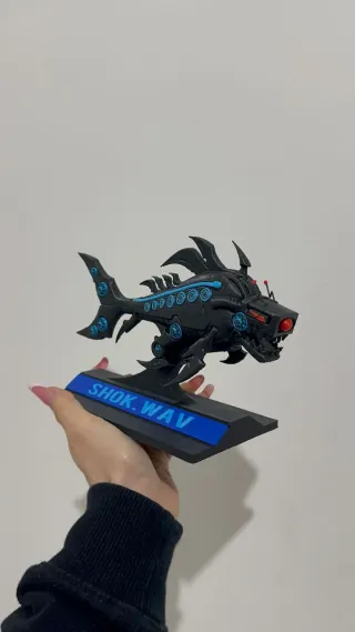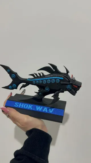 Modello dello squalo Vox di Hazbin Hotel. - Design nero con dettagli blu. - Supporto nero con scritta SHOK.WAV.