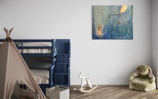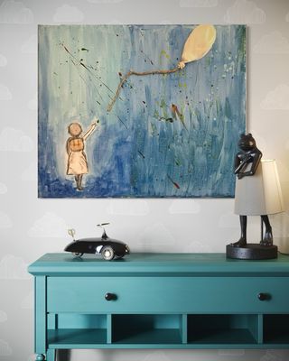 Quadro decorativo dipinto a mano, con tecnica mista. Palloncino 3D vero. - Soggetto: bambino con palloncino - Colori predominanti: blu, bianco, beige. - Elementi tridimensionali applicati (ramo, stoffa). - Dimensioni: 30x40 cm.