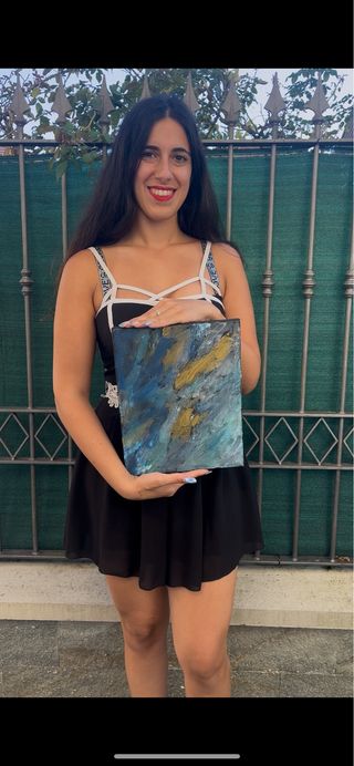 Opera d'arte astratta con tonalità di blu e oro. - Pittura acrilica su tela. - Dimensioni: 20x30 cm circa.