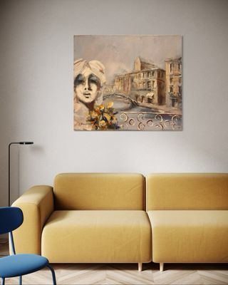 Opera d'arte astratta con un volto stilizzato e un paesaggio di canale. Quadro Umberto Bianchini certificato Prezzo trattabile - Tecnica mista su tela. 40x50 cm la tela - Cornice inclusa.