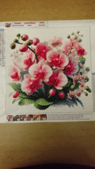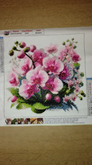 Quadretto Diamond Painting con un bellissimo disegno di orchidee rosa. Pronto per essere incorniciato e appeso. - Dimensioni: 30x30cm.