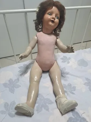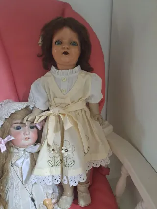 Bambola antica in perfette condizioni, un pezzo da collezione.qualche difetto dovuto ai suoi anni ma molto bella Grande circa 60 cm Parrucca castana con fiocchetto e occhi azzurri cliccanti Materiale tipo legno /composizione