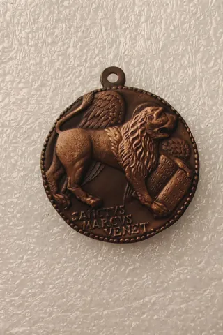 Medaglia raffigurante il leone di San Marco. - Incisione Sanctus Marcus Venet sul bordo. - Dettagli finemente lavorati sul leone e sul libro. - Anello per appenderla.
