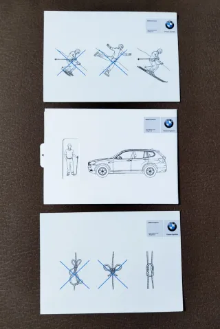 Set di cartoline promozionali BMW X3 Games per collezionisti. - Immagini illustrative di attività sportive invernali. - Illustrazione di un'auto BMW X3. - Disegni di nodi e corde.