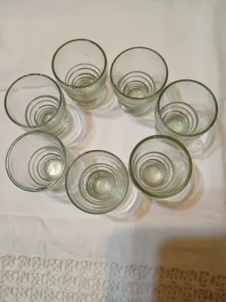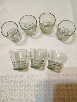 Set di bicchierini vintage anni 40 in vetro trasparente colore verde acqua - Design classico con righe decorative alla base. - Materiale: Vetro. - Quantità: 7 pezzi. Misura in foto Presenta alcune imperfezioni di fabbricazione, piccolissime bolle d'aria. Si possono notare zummando le immagini