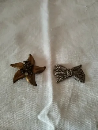 Set di due spille vintage, una a forma di fiore e una a forma di fiocco. - Spilla a forma di fiore in metallo color bronzo con un piccolo strass. - Spilla a forma di fiocco ricoperta di piccole pietre scure. Presentano qualche segno di usura dovuto al tempo. Il prezzo si riferisce ai 2 pezzi.