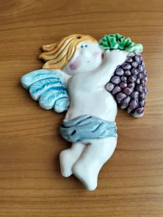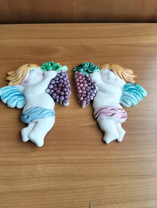 Deliziosa coppia di angioletti in ceramica, perfetti per aggiungere un tocco vintage alla tua casa. Misure cm.13 x h.16 - Angioletti che sorreggono grappoli d'uva. - Dettagli colorati e finiture curate. - Ideali come decorazione murale. Sono presenti delle piccole scalfitture come evidenziato in foto . Il prezzo si riferisce alla coppia.