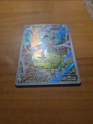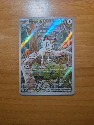 Carta Pokémon di Meowth, numero 106/094, dall'espansione Fiamme Spettrali, sbustata e messa in sleeve.