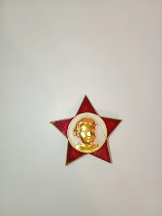 Spilla a forma di stella rossa con un ritratto dorato al centro. - Design a stella a cinque punte. - Dettaglio del ritratto in rilievo. - Colore rosso e oro. Autentica con il prezzo originale al retro e chiusura di epoca