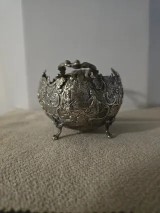 Elegante zuccheriera in argento, finemente lavorata. - Design decorato con motivi floreali e figure. - Dotata di manici laterali. - Appoggiata su piedini. - Materiale: Argento.