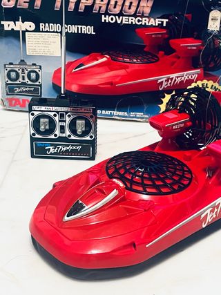 Taiyo Jet Typhoon radiocomandato Vintage Condizioni perfette Perfettamente funzionante Gonna (gomma sotto) perfetta Completo di scatola La scatola è danneggiata ma integra Hovercraft molto raro in queste condizioni Tyco jet typhoon Auto rc macchina telecomandata No nikko tamiya kyosho marui