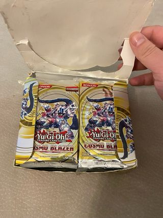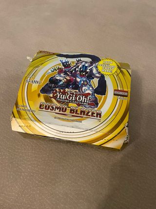 Box di carte Yu-Gi-Oh! Cosmo Blazer in prima edizione. In totale sono 22 pacchetti, non so se sono originali oppure no perché non ho trovato abbastanza informazioni su Internet a riguardo - Contiene 9 carte per pacchetto. - Età consigliata: 6+ anni. - Include la possibilità di trovare carte Ghost Rare leggendarie.
