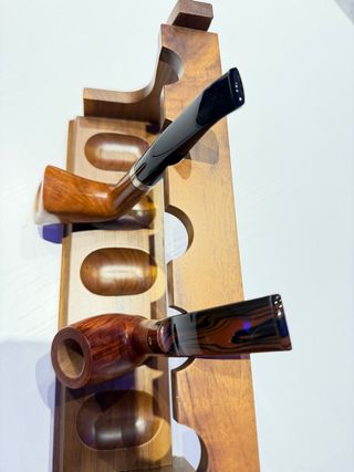 Elegante porta pipa in legno, ideale per esporre e conservare le tue pipe. - Realizzato in legno pregiato. - Design a più livelli per diverse pipe. - Finitura liscia e curata.