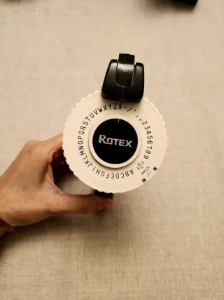 Etichettatrice manuale Rotex per creare etichette personalizzate. - Ruota con lettere dell'alfabeto. - Ruota con numeri. - Leva per il taglio.