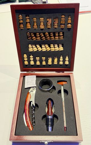 Elegante set di accessori per vino, presentato in una scatola a tema scacchi. Ideale per gli amanti del vino e degli scacchi. - Scatola in legno scuro. - Set di pezzi degli scacchi in legno. - Cavatappi. - Tappo versatore. - Termometro per vino.