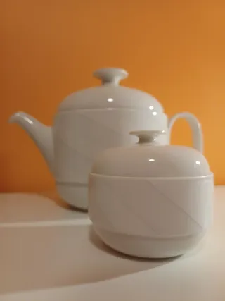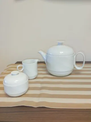 Elegante set in porcellana bianca Rosenthal Studio-Line, produzione tedesca. Design moderno e minimale, impreziosito da un delicato decoro geometrico inciso che dona raffinatezza senza appesantire lo stile. Il set è composto da: - teiera con coperchio - zuccheriera con coperchio - lattiera Condizioni eccellenti, senza sbeccature, crepe o segni evidenti di usura. Perfetto sia per l’uso quotidiano che come complemento di design o da collezione. Marchio originale Rosenthal con timbro sul fondo. Venduto preferibilmente in blocco.