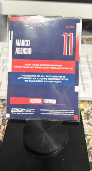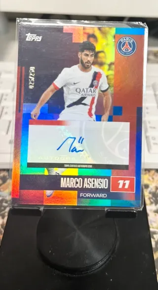 Rara carta autografata di Marco Asensio del Paris Saint-Germain (PSG) della Topps. - Edizione limitata: 025/250 - Autografo certificato Topps - Giocatore: Marco Asensio - Ruolo: Attaccante - Numero maglia: 11