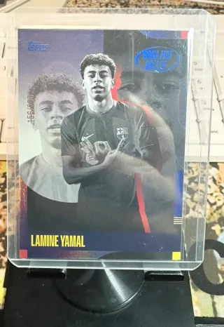 Rara carta Topps di Lamine Yamal, edizione limitata Bona Fide Baller. - Numero di serie: 156/250. - Design accattivante con immagini sovrapposte. - Logo Topps ben visibile.