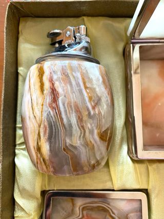 Elegante set da fumatori composto da accendino e due posacenere, ê portasigarette realizzati in onice. - Accendino con finitura in metallo e corpo in onice. - Due posacenere quadrati con inserto in onice e base in metallo. - Design unico con venature naturali dell'onice.