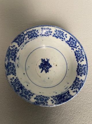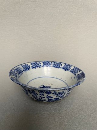 Raffinata ciotola antica (risalente al XVIII o XIX secolo, durante la dinastia Qing) di manifattura cinese, con decorazioni floreali in blu cobalto su fondo bianco (diam. cm 14x h 6). Il motivo floreale è un tema comune nell'arte cinese e può simboleggiare la longevità o il ritorno eterno della primavera Presenta una piccola sbeccatura sul bordo superiore.
