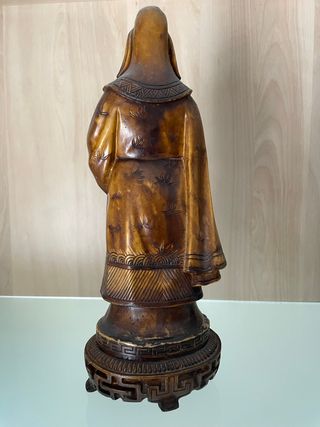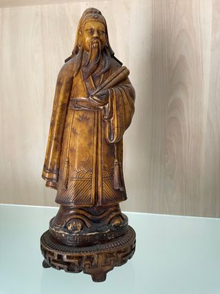Raffinata statua antica in porcellana di uno dei Tre Saggi cinesi (h cm 27,5x 11), divinità della mitologia cinese, detti San Xing, letteralmente i tre astri, anche indicati col termine Fu Lu Shou. In ottimo stato. Dim. cm 27,5x cm 11. Tiene in mano il simbolo chiave di conoscenza, saggezza e apprendimento; statua considerata portatrice di saggezza o fortuna