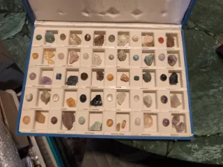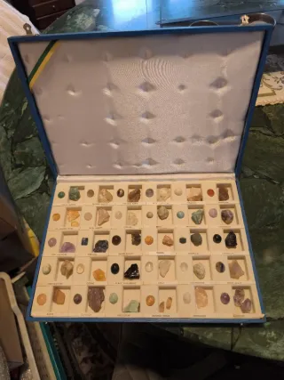 Collezione di minerali del Brasile presentata in elegante scatola blu. 30 esemplari grezzi e 30 esemplari levigati. La scatola ha un rivestimento interno in tessuto. Scatola perfetta, interno con alcuni segni del passare degli anni (ingiallimento). Questa collezione ha più di 40 anni.