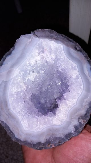 Pezzo molto bello con agata e cristalli di ametista di un lieve colore viola.