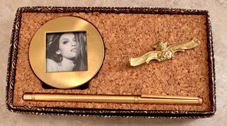 Elegante scatola regalo vintage, perfetta per la prima comunione. Contiene una cornice portafoto rotonda in metallo dorato e una penna. - Cornice portafoto rotonda. - Penna in metallo dorato. - Spilla decorativa con iscrizione. Ricordino vintage degli anni 70 composto da cornice portafoto in ottone e legno (diametro esterno 5,5 cm dimensioni foto 3 per 3 cm) e penna dorata in ottone (lunghezza 12,5 cm). Il tutto confezionato in scatola originale di cartone e sughero. Il set si trova in ottimo stato sarà accuratamente imballato e spedito.