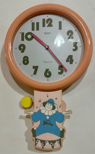 Orologio da parete vintage Breil con un design unico. - Cornice color pesca. - Quadrante bianco con numeri verdi. - Lancette rosa. - Decorazione a forma di clown con palline. - Scritta PERROT sul fondo. Orologio Breil da parete vintage in legno metallo e plastica con movimento meccanico delle palle del giocoliere. L'orologio è nuovo si trova in ottimo stato funzionante e sarà fornito di certificato di garanzia. Ha altezza massima 42 cm e diametro dell'orologio 26 cm. Sarà accuratamente imballato e spedito.