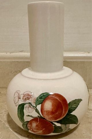 Elegante vaso in porcellana, decorato a mano con un motivo floreale e fruttato. Un pezzo unico che aggiunge un tocco di raffinatezza. - Decorazione con pesche e fiori. - Realizzato in porcellana di alta qualità. - Made in Italy. Bellissimo vaso decorato a mano in porcellana della ditta SIC Made in Italy. Il vaso è nuovo si trova in ottime condizioni reca sul fondo il marchio del produttore. Ha altezza 16 cm e diametro massimo 13 cm. Sarà accuratamente imballato e spedito .