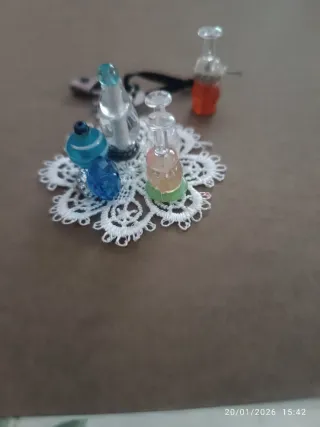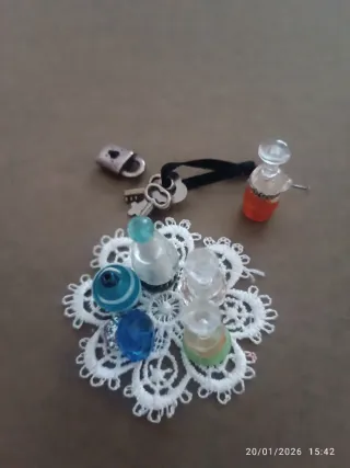 Set di miniature per decorare la tua casa delle bambole o per collezionare. - Accessori: collare, anello, flaconi di profumo e una lampada. - Moneta da 5 centesimi di euro indicativa per le dimensioni dei profumi e della lampada. - Mobili non inclusi nel prezzo. #miniature #collezionismo #casa delle bambole