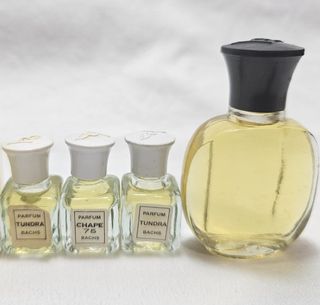 Set di 4 miniature di profumi del marchio Bachs. Include una miniatura da 10ML Chape 75 senza etichetta. Include due microminiature di Parfum Tundra. Include una microminiatura di Chape 75. Miniature da collezione, nuove, provenienti da collezione privata.