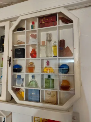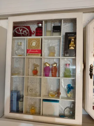 Armadio espositore elegante con specchio, perfetto per collezionare ed esporre miniature di profumi. Il suo design vintage con dettagli floreali sulla cornice gli conferisce un tocco speciale. Include miniature di profumi.