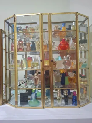In vendita vetrina in vetro con o senza collezione di miniature di profumi: 80€ tutto, 60€ solo vetrina. Con specchio sul fondo e ganci per appendere a parete. Design in vetro e metallo dorato.