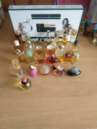 Set di miniature di profumi vari. Include diverse marche e fragranze. Ideale per collezionisti o per provare diversi aromi.