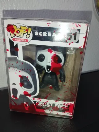 Funko Pop! Movies di Ghost Face, numero 51, dal film Scream. La confezione presenta un design a tema con schizzi di sangue. - Personaggio: Ghost Face - Serie: Movies - Numero: 51 - Tema: Scream