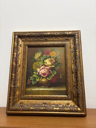 Bellissimo quadro antico con una composizione floreale. - Cornice dorata e decorata. - Dipinto a olio su tela.