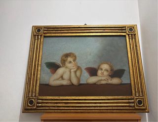 Bellissimo quadro antico raffigurante due angeli. - Cornice dorata elaborata. - Tela con screpolature tipiche dell'età.