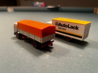 Lotto composto da due modellini di camion in scala 1:87. - Un camion bianco con cassone arancione. - Un camion bianco con cassone giallo e scritte Autolack Service.