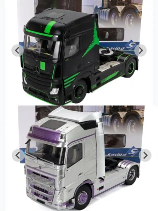 Modellini di camion in scala. - Camioncino Mercedes nero con dettagli verdi. - Camioncino Volvo argento con dettagli viola. - Prezzo per 1 modello.