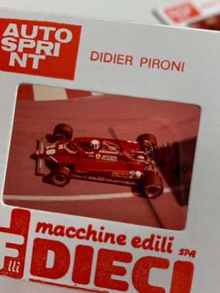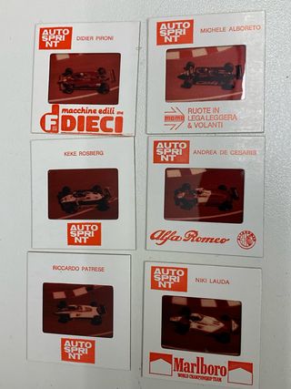 Sei diapositive originali della rivista Auto Sprint dedicate alla Formula 1. - Piloti inclusi: Didier Pironi, Michele Alboreto, Keke Rosberg, Andrea De Cesaris, Riccardo Patrese, Niki Lauda. - Marchi: F.Dieci, Momo, Alfa Romeo, Marlboro.