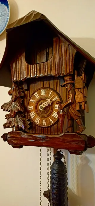 Vendo splendido orologio a cucù originale in legno, finemente intagliato a mano, con scena alpina e personaggio boscaiolo. Un pezzo di grande fascino e qualità, tipico della tradizione tedesca della Foresta Nera. ✔️ Movimento meccanico a carica manuale ✔️ Funzionamento a pesi (pigna) ✔️ Cucu funzionante ✔️ Struttura interamente in legno massello ✔️ Quadrante con numeri romani ✔️ Pendolo e catene originali ✔️ Oggetto scenografico e decorativo Ideale per collezionisti, amanti dello stile vintage e dell’arredamento rustico/montano. Condizioni molto buone, come da foto. 🚚 Spedizione disponibile