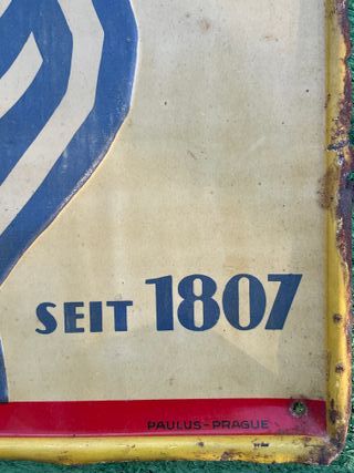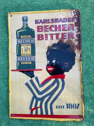 Insegna pubblicitaria originale in metallo per Karlsbader Becher Bitter, con la sua patina originale, come da foto, raffigurante una bottiglia di Becher Bitter e un bambino con una bottiglia. - Dimensioni: 35x25 cm, materiale metallo. Tale cartello pubblicizza il famoso liquore amaro alle erbe di colore giallo verde prodotto esclusivamente a suo tempo dall'azienda Jan Becker.