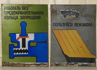 Due unità di insegne, segnali, cartelli o targhe industriali originali da fabbrica o cantiere in latta o lamiera serigrafate provenienti dall'URSS databili 1983 da un recupero di una vecchia officina dismessa. Le insegne si presentano in buone condizioni generali estetiche con ancora una splendida brillantezza e con lievi segni di usura che non intaccano la bellezza degli oggetti ma che anzi testimoniano la loro età. Le insegne sono vintage mai restaurate e con la loro patina originale. Le foto sono parte integrante della descrizione. Oggetti visti e piaciuti da foto.